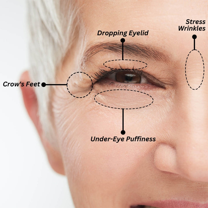Signs of aging around the eyes include fine lines, wrinkles, crow’s feet, puffiness, and dark circles. Thinner and more delicate skin in this area is susceptible to collagen loss, reduced elasticity, and other age-related changes influenced by both genetic and environmental factors like sun exposure and lifestyle choices.